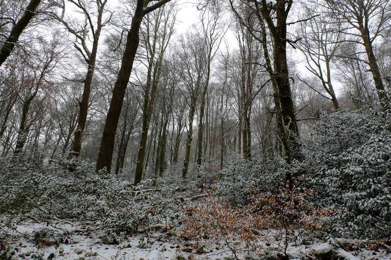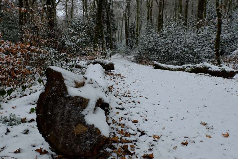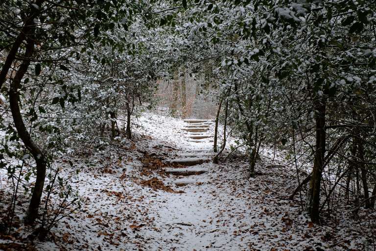 J'entame alors la montée, tantôt sur les sentiers balisés, tantôt sur le route d'asphalte blanc qui monte jusqu'au sommet. Dans les bosquets je dérange une armée invisible d'oiseaux, merles et mésanges qui s'enfuient sans bruit alors que j'avance sur les lits de feuilles mortes et la neige en congères. La marche est vraiment apaisante.