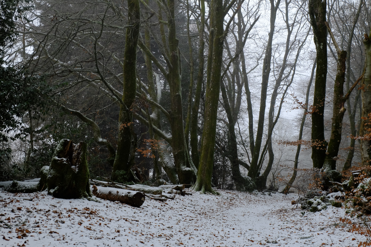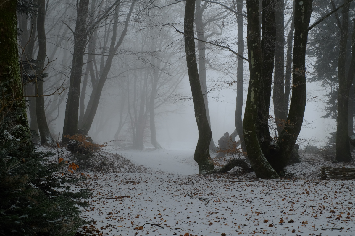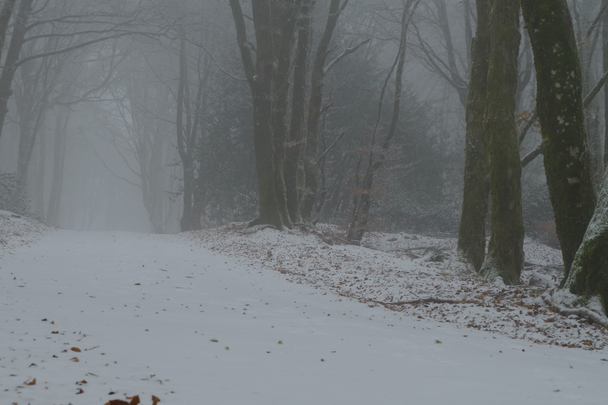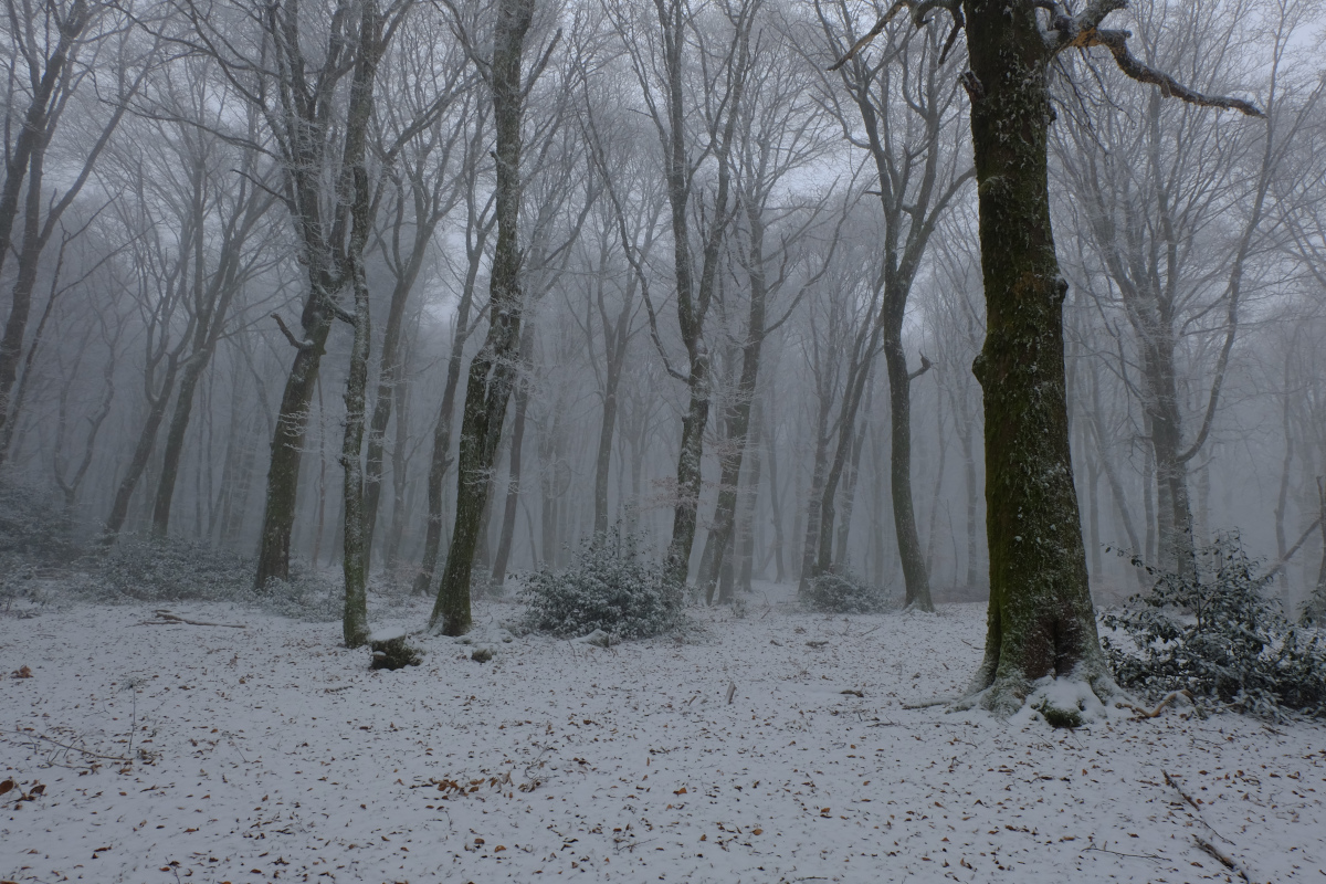 Une brume opaque se distille alors sur le chemin et je dois m'efforcer de garder le cap, comme mystérieusement entraîné vers cette antique forêt pleine de songes. Je continue de shooter bien que les flocons parviennent à percer les frondaisons et s'accumulent sur l'objectif. Mais le sommet n'est plus très loin et je force le pas.