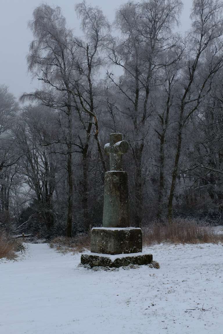 Enfin j'aperçois le haut de la colline ! Le vent s'intensifie alors et des rafales de neige me fouettent le visage. Quel étrange changement de météo ! Je marche jusqu'à la stèle et à la table d'orientation mais la bise redouble de vivacité et je me rends compte que j'ai perdu mes gants. Anecdotique, mais ennuyeux avec ce froid pour continuer de prendre des photos.
